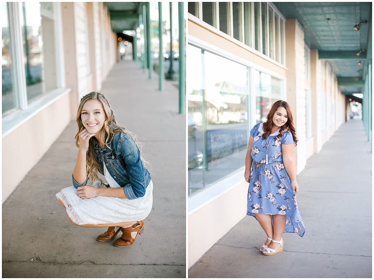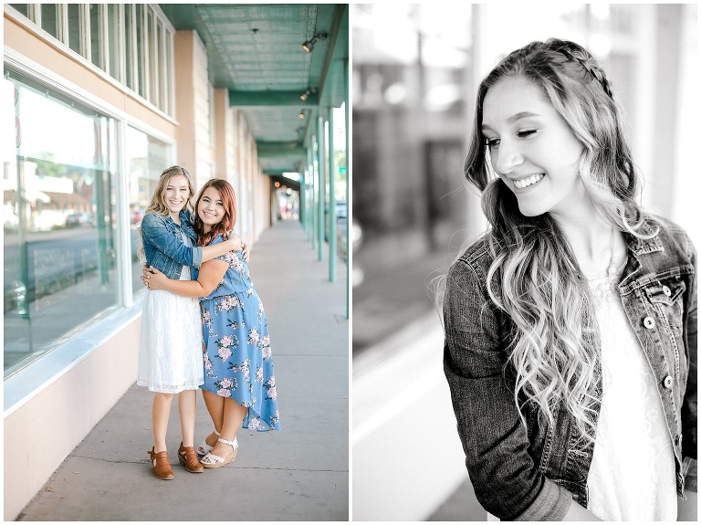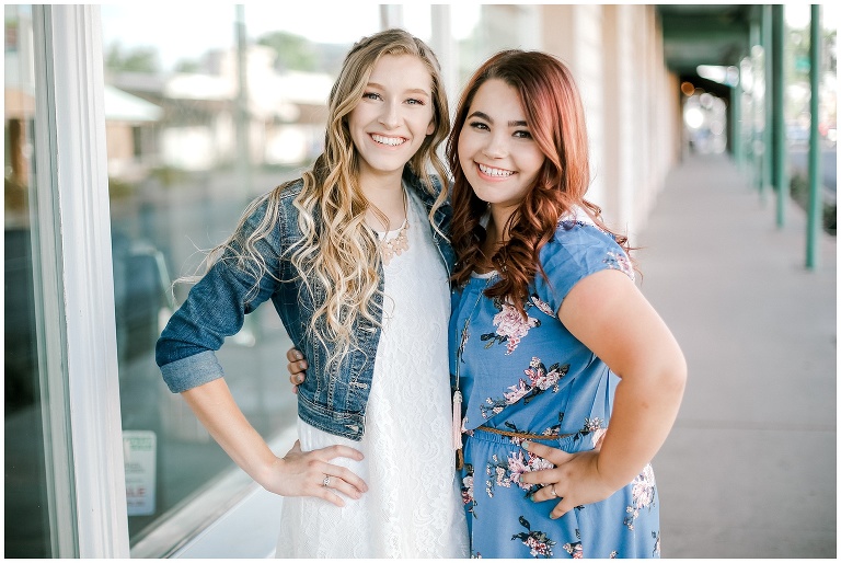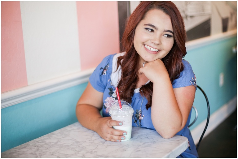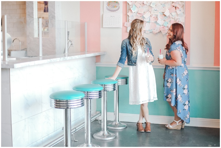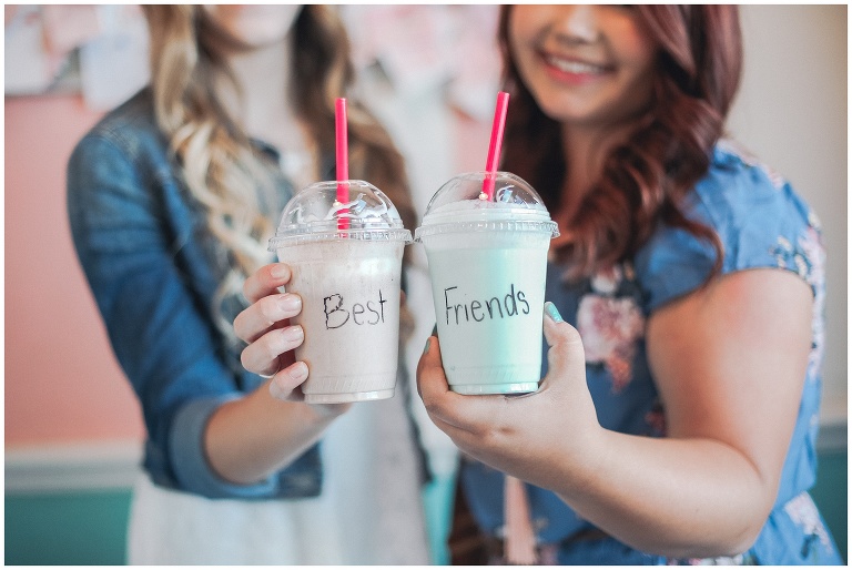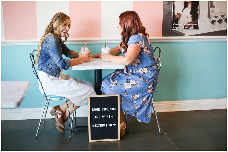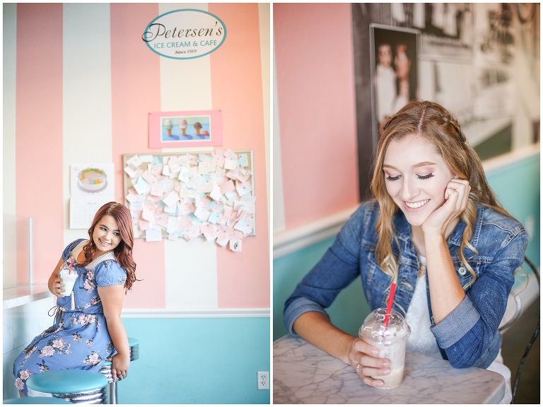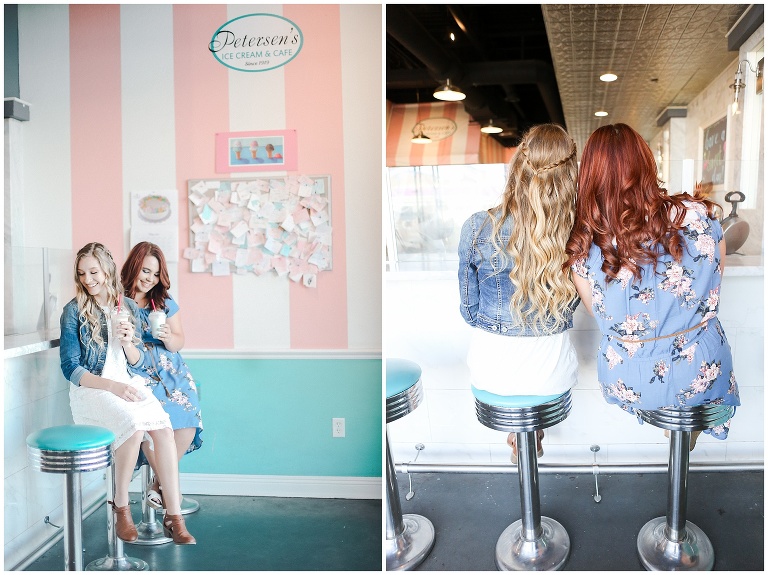 How fun is this best friend session? 🙂 These two wanted a session… but I wasn’t sure where to go. What better place than an ice cream shop? Petersen’s is the cutest little shop! I collaborated with Morgan K Beauty for this session. She was so inspired by the colors of Petersen’s. Morgan used peach and that beautiful blue as the eyeshadow colors. She  was so much fun to work with. Didn’t she do a great job?
